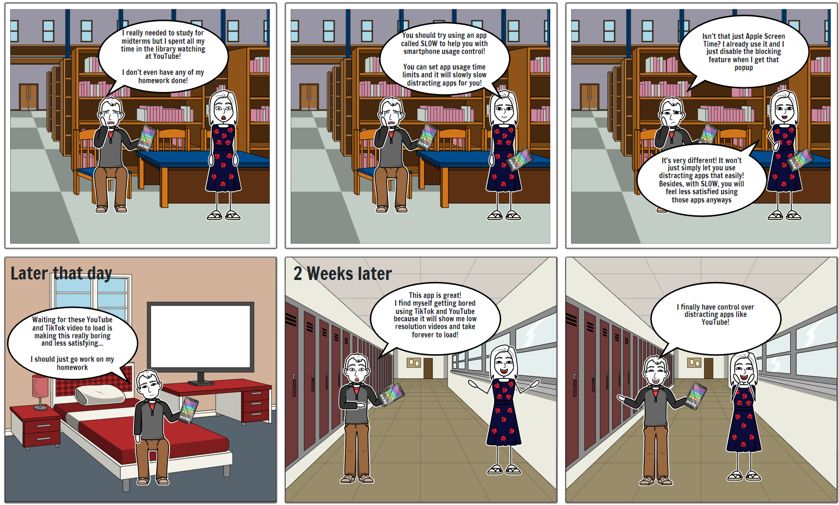 Instead of completely blocking users from apps, SLOW adds friction, and make distracting app usage less satisfying. SLOW will throttle network traffic to increase loading times when user uses distracting websites. SLOW’s target audience is for people who use their computer for studying and working but have trouble focusing because of distracting websites. A prototype version of SLOW is a Google Chrome extension.